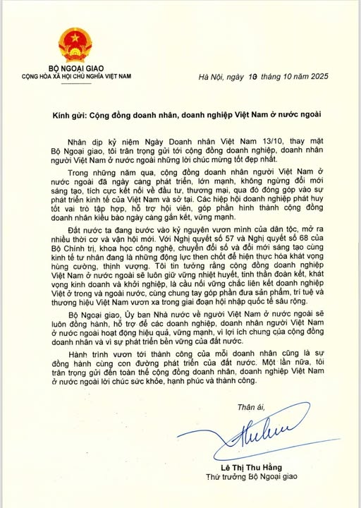 Thư chúc mừng nhân dịp ngày Doanh nhân Việt Nam